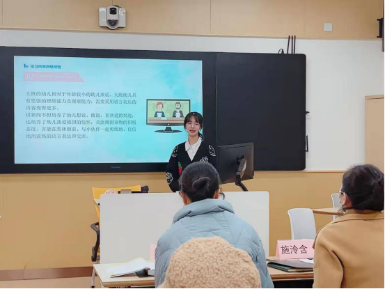 为了检验学生的教育实践成果,提高教师针对性指导的质量,本次教育实践结束后,由每位指导教师推选出一名学生,在全系进行展示交流。汇报展示活动分两个部分进行,分别是8到10分钟的PPT试讲和5分钟答辩环节。学前教育系5位专业主任和部分骨干教师担任了活动评委,部分指导老师和辅导员参加了现场观摩,为汇报学生加油助阵。