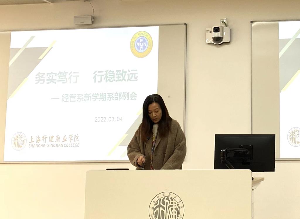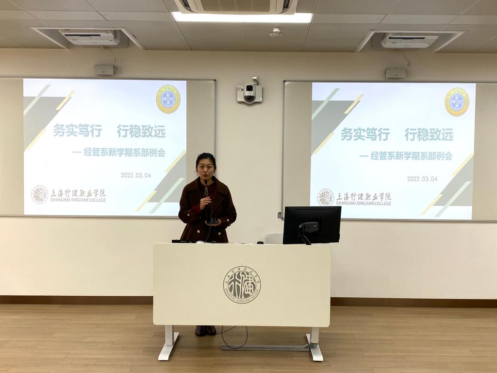 会上,孙副主任以“务实笃行 行稳致远”为主题从专业建设规划、产教融合项目、教学质量提升、中高贯通培养、教育评价改革、国际交流、双师队伍建设等方面介绍了经管系本年度工作计划和重点工作安排。她要求全系教师同心协力做好本学期各项教育教学工作,对高校学科专业体系建设的思路、目标、模式和机制等进行全新了解。针对疫情防控工作,她要求全体教职工遵守学院疫情防控要求,支持配合学院各项工作,并再次强调了学校疫情防控常态化下健康管理的重要性。最后,她希望新学期全体教职工一起努力,服务于师生、服务于学院、服务于高职发展。