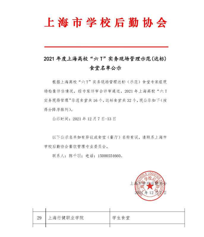 在实地检查评审过程中,评估工作组全面检查了学院食堂的硬件建设、软件管理和日常运行情况。检查组对学院食堂管理工作给予充分肯定,推荐学院评选2021年度上海高校“六T”实务现场管理达标食堂,并在上海市学校后勤协会官网上予以公示。