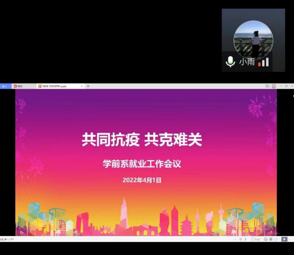 为做好学前教育系2022届毕业生就业工作,进一步结合当下疫情就业形势,解放思想、创新方法、精准发力,促进毕业生更高质量就业,4月1日下午,学前系通过腾讯会议的方式线上召开了2022届毕业生就业工作推进会,系主任李娜,全体毕业班辅导员及学生事务秘书参会。