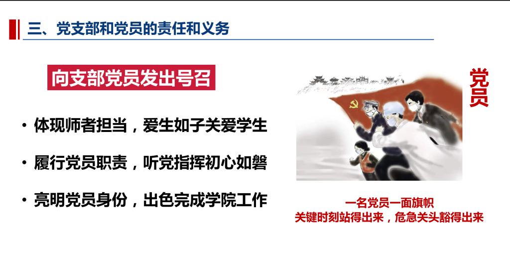学院党委向全体党员提出四点号召,第一,提高防疫意识。坚决拥护坚持动态清零的总方针,坚定信心,作到科学防疫;第二,加强阵地意识。当疫情发生的时候,校园是我们的主阵地,当学院需要之时,所有人要做到呼之即来,来之即战;第三,提高奉献意识。作为共产党人应坚持吃苦在先,享受在后,在抗疫过程中始终锻造无私奉献的品格;第四,增强规矩意识。不断提高党员的纪律观念,政治定力以及政治方向,共同扛起应有的责任与担当。疫情就是命令,旗帜彰显担当,希望广大党员发挥党员先锋模范带头作用,自觉同以习近平同志为核心的党中央保持高度一致,为坚决打赢疫情防控阻击战而努力奋斗。