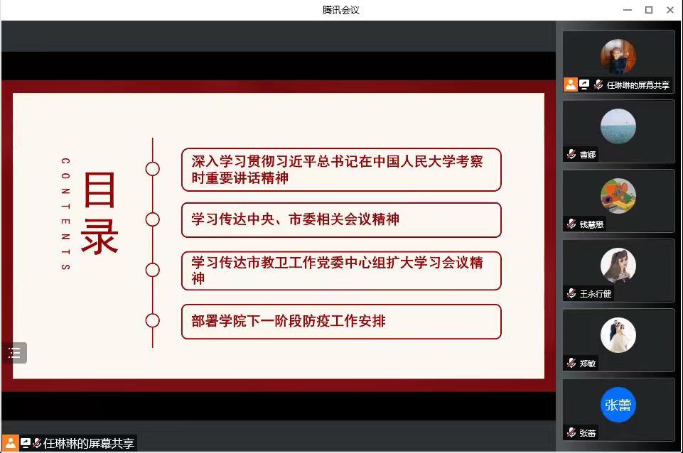5月9日,学院召开专题会议,传达学习习近平总书记主持召开的中共中央政治局常委会会议精神以及上海市委相关会议精神,进一步部署学校疫情防控工作。会议由学院党委书记沈燕华主持,校级干部、中层干部线上参会。