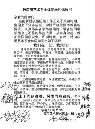 罗雄主任首先传达了学院关于疫情防控工作会议的最新通知,根据学院统一要求,部署学系相关工作,他表示现在学院的稳定局势是上下一心、守望相助、排除万难才取得的,现阶段正处于新冠疫情防控工作关键时期,成果来之不易,希望艺术系全体师生珍惜防控成果,严格按照学院的要求,遵守各项防疫管理规定,响应号召、严防死守,从自身做起,维护校园健康安全、和谐稳定。会上,特向应用艺术系全体学生发起《致应用艺术系全体同学的倡议书》,倡议自觉做到五点内容,尤其是承诺抗原不作假、核酸不代测等,各班级辅导员已通过班会全部传达到位。