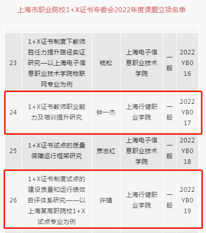 根据《上海市职业院校1+X证书制度试点专家委员会关于公布2022年度课题立项名单的通知》,学院经管系钟一杰老师和科发处许婧老师的课题均获批准立项。两位老师的课题聚焦1+X证书试点工作与学院星空体育网址入口融合过程中的热点、难点问题。此次立项进一步强化了学院教师对1+X证书工作的理解与思考,对进一步推动1+X试点工作落实落地具有积极的意义。(科发处)
