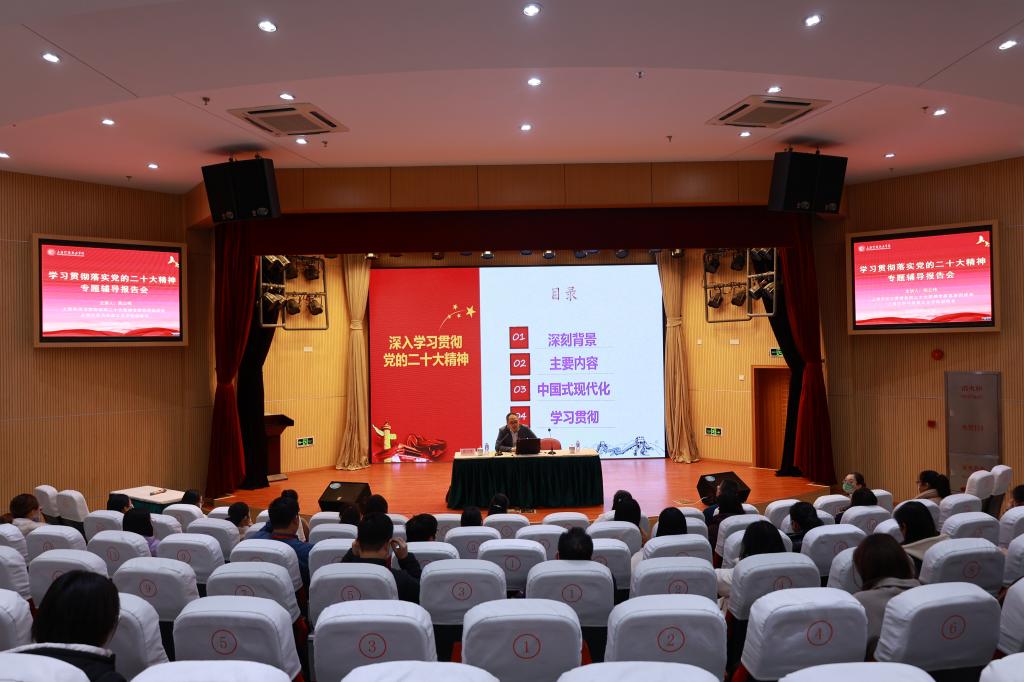高立伟教授从党的二十大深刻背景、主要内容、中国式现代化和学习贯彻四个方面全面系统地解读了党的二十大精神。深刻阐释了中国式现代化的中国特色、本质要求、重大原则,深入解读了推进中国式现代化这一中心任务和坚持党的全面领导和全面从严治党、弘扬斗争精神,强调了学习党的二十大精神要着重把握深刻领悟“两个确立”的决定性意义。围绕如何学习贯彻党的二十大精神,高教授提出要避免十种误区、十种方法以及贯彻落实二十大精神的关键落脚点等。与会人员一致表示,高教授的专题辅导报告紧扣主题、理论性强、脉络清晰,对全院教职工深刻理解和准确把握党的二十大精神具有重要意义,是一场理论性强、生动而深刻的辅导报告。