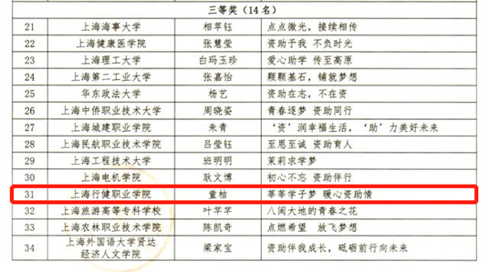 2023年1月,由上海市学生事务中心举办的第五届“我为资助代言”2022年上海高校十佳学生资助宣传大使评选活动公布了评选结果。学前教育系童桔同学荣获上海高校十佳学生资助宣传大使活动三等奖,学生处谢冬梅老师荣获“我为资助代言”“优秀指导教师”称号,学院荣获“我为资助代言”“优秀组织奖”称号。