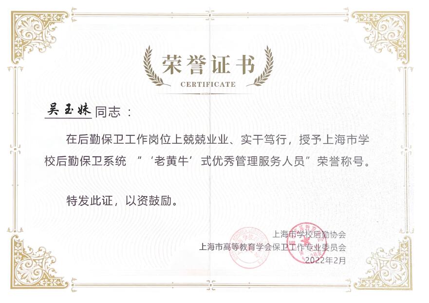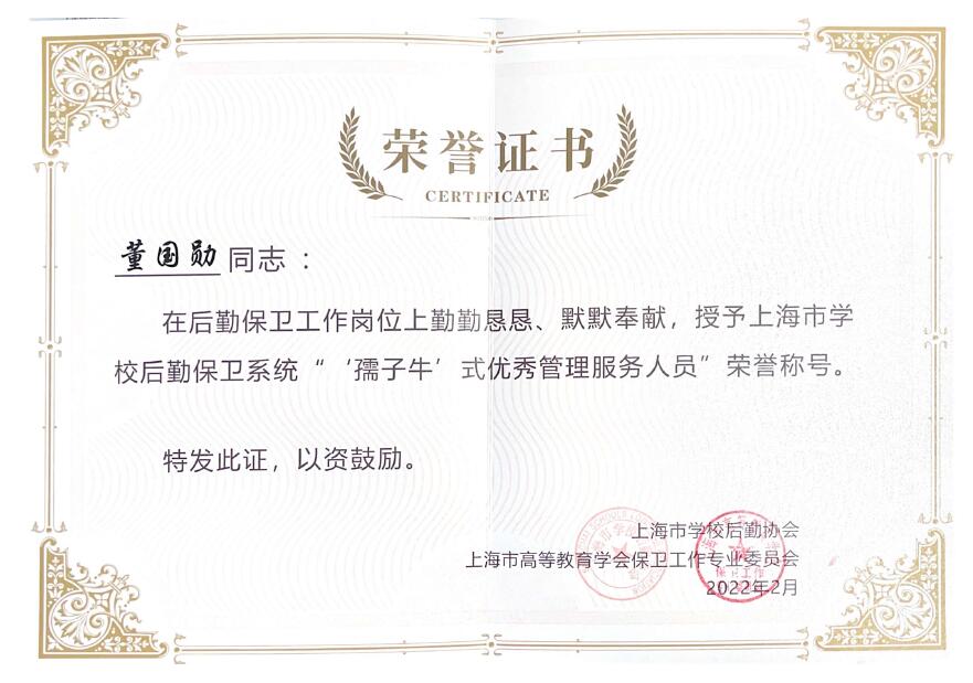 在此次表彰活动中,学校后勤保卫处董国勋同志和学生公寓物业吴玉妹同志分别被授予“上海市学校后勤保卫系统‘孺子牛’式和‘老黄牛’式优秀管理服务人员”荣誉称号。