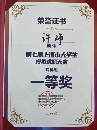 4月13日,第七届上海市大学生模拟求职大赛在华东理工大学举办,学校就业指导课程教研组俞晖、周萍老师带领学前教育系许峥同学、商务外语系钟晓薇同学、信息技术与机电工程系罗霜妍同学参赛。经过单人面试、群面(无领导小组讨论及情景模拟)、自我风采展示和现场答辩三轮高强度竞赛环节,许峥同学以综合成绩87.864的最高分独占鳌头,获得专科组一等奖。钟晓薇和罗霜妍同学获得优胜奖。