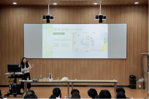 讲座伊始,周老师和学生们进行互动,了解了他们的收纳困惑和需求。接着,周老师讲到整理就是化繁为简,直击目标的想法。她介绍了整理术的三个层次,即空间整理术、信息整理技术和思维整合技术。周老师利用优衣库、乔布斯等例子,使学生深入了解了合理运用整理术的优点。