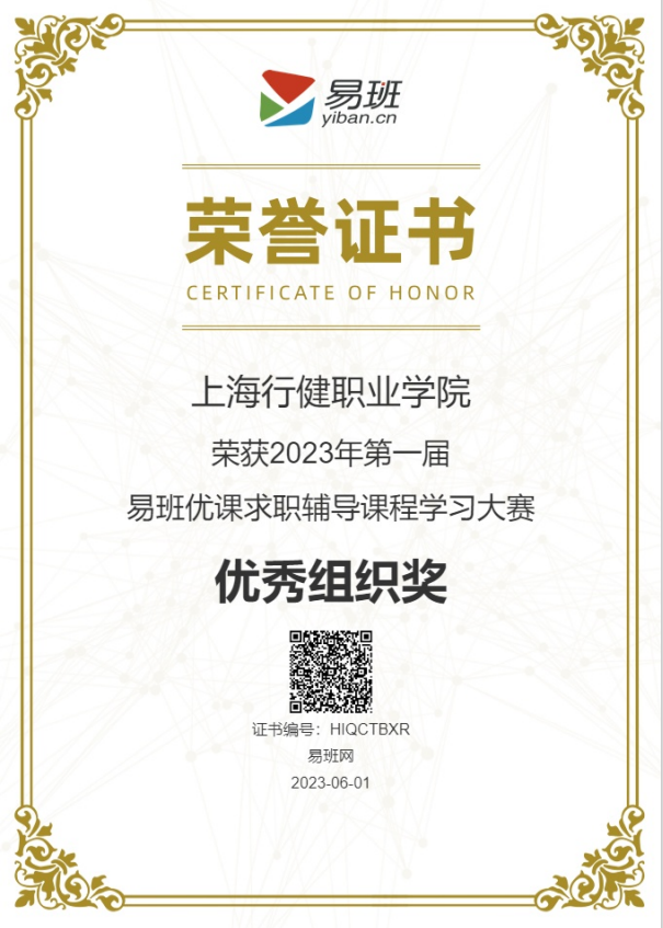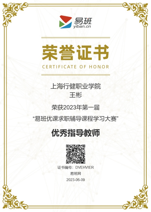 近日,由教育部易班发展中心、“易班网”主办的2023年第一届易班优课求职辅导课程学习大赛活动落下帷幕。本次活动全国总计21个省142所易班共建高校报名参赛,总计47.3万大学生参与学习活动,上海高校仅2所入围,我校的课程学习活跃度较高,荣获“优秀组织奖”。学生处王彬老师荣获“优秀指导教师”称号。