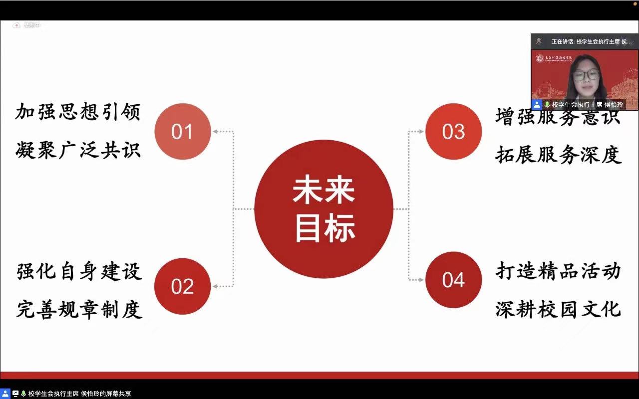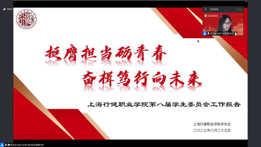 学校学生会执行主席侯怡玲同学代表第八届学生会作题为《以奋斗姿态激扬青春谱写新时代青年之歌》的工作报告。报告围绕学生会自身改革,全面回顾了过去一年的工作,同时提出了今后的工作展望和奋斗目标。