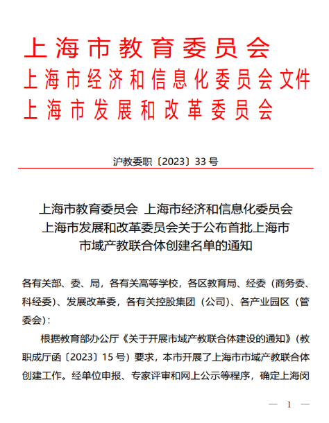 根据《教育部办公厅关于开展市域产教联合体建设的通知》(教职成厅函〔2023〕15号)和《上海市教育委员会上海市经济和信息化委员会上海市发展和改革委员会关于开展上海市市域产教联合体创建工作的通知》(沪教委职〔2023〕19号)工作要求,我校积极联合上海市静安区人民政府,上海市市北高新技术服务业园区,中、本院校及科研机构,在前期工作基础上探索市域联合体建设新模式。日前,上海市教委、市经信委、市发改委联合发布公告,我校与上海市北高新(集团)有限公司牵头成立的上海市北高新园区产教联合体成功入选上海市首批市域产教联合体。