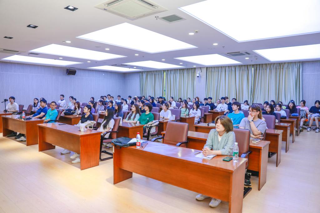 丁玲老师首先为全体师生介绍了专业近年来的发展情况和教育教学成果。随后,全体师生与合作院校——法国亚眠高等商学院校长Yann Tournesac现场连线。Yann Tournesac校长介绍了商学院的教学环境、地理位置和优秀的合作课程,尤其介绍了中国留学生的学习、生活保障体系。他鼓励各位新同学努力学习,早日实现留学法国的梦想。
