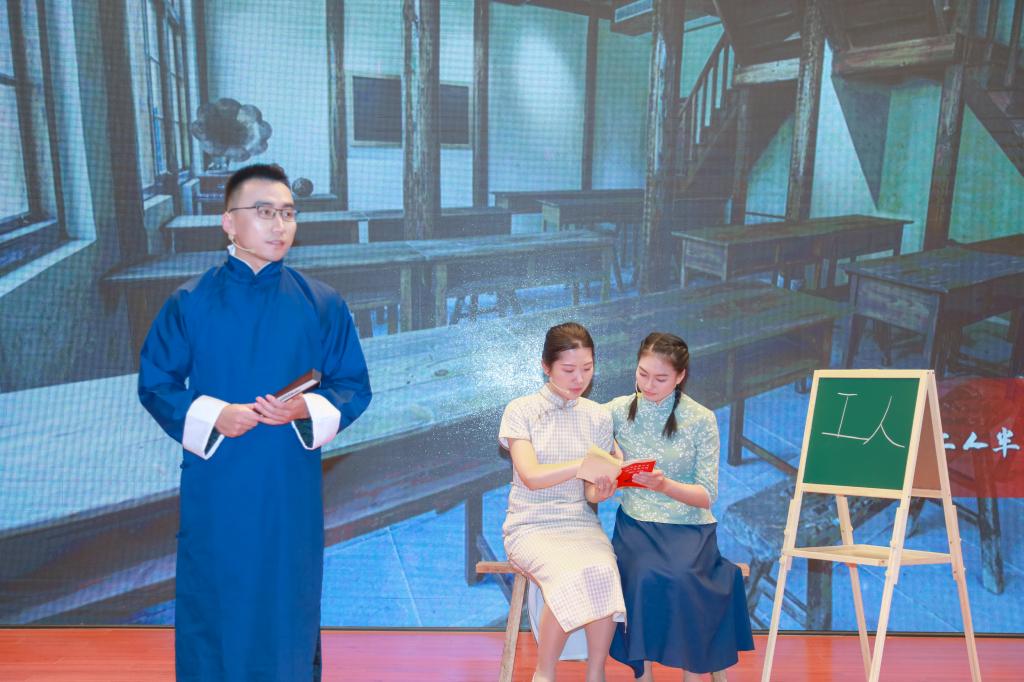随后,在场师生们跃入历史长河,欣赏由静安区文史馆讲解老师们带来的博物馆公教课《峥嵘岁月》。演出伊始,身穿长衫的说书人出现在舞台中央,“‘忆往昔,峥嵘岁月稠’,无数革命先辈抛头颅、洒热血,为我们换来了中华民族此刻和平而自信的时代。”伴随着掷地有声的旁白,一则则动人的英雄故事娓娓道来。通过《李启汉的工人半日学校》、《毛泽东的全家福》、《革命姐妹大姜与小姜》、《三曾里的关捐行》、《黎明前的诀别》五幕内容,让静安区红色场馆里的英烈故事、战斗时的感人细节以及舍生忘死的革命精神鲜活地“走出去”,带领师生们从百年党史的峥嵘岁月中,追溯中国特色社会主义道路的世界观、方法论及其立场观点方法的渊源,以史为鉴、踔厉奋发。短短45分钟的演出,现场的老师学生们沉浸其中,更不时为革命先辈的感人故事动情落泪。