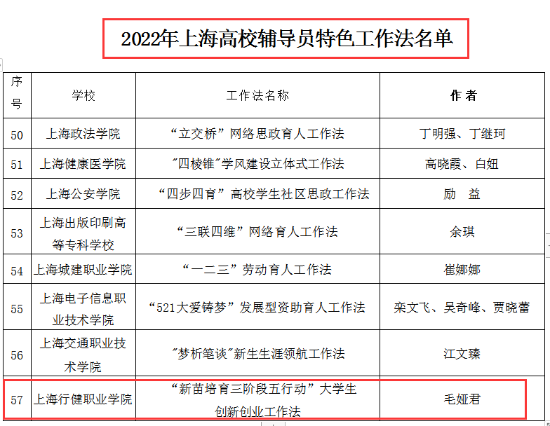 近日,上海市教育委员会公布了2022年上海高校辅导员特色工作法名单。我校选送的《“新苗培育三阶段五行动”大学生创新创业工作法》成功入选,该案例由儿童发展与教育学院书记毛娅君申报。
