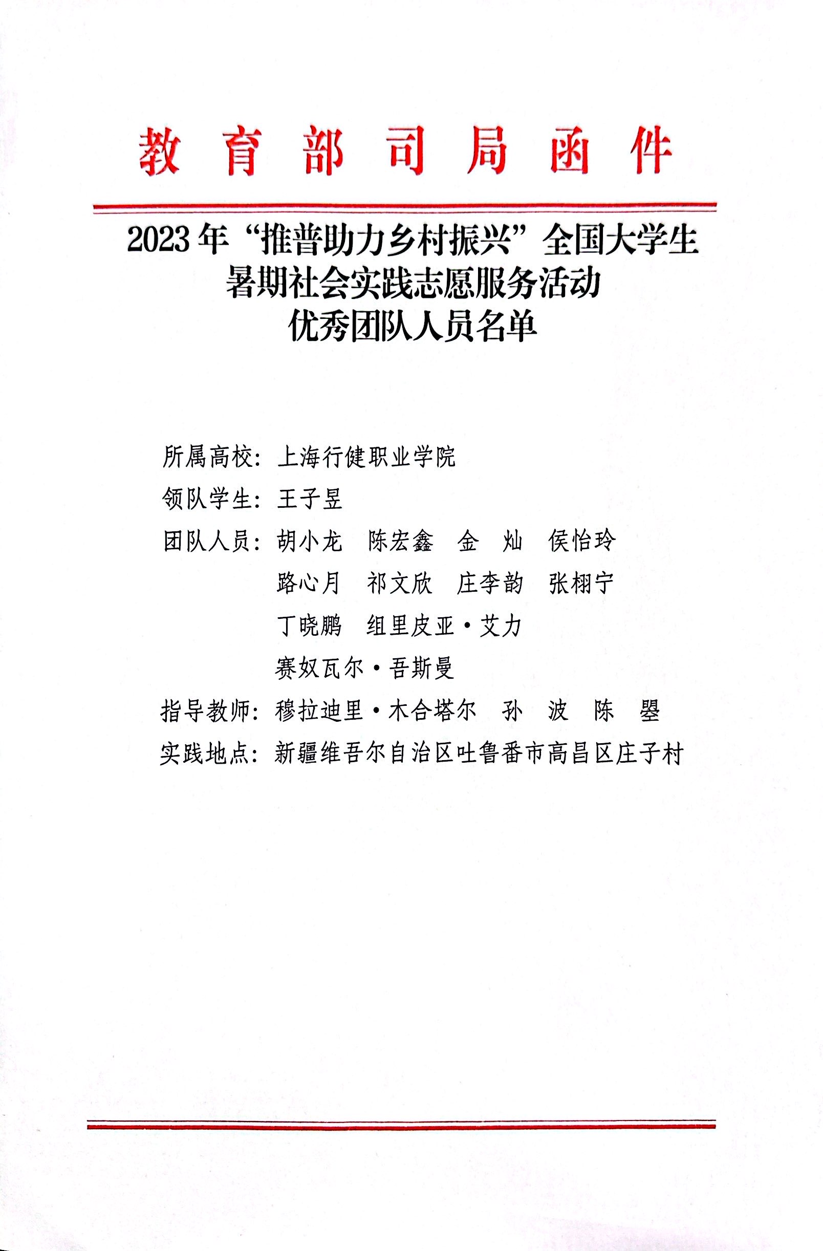 2023年暑期,我校“石榴籽”大学生社会实践帮扶团队赴新疆吐鲁番市高昌区庄子村等地开展了为期10天的推普帮扶服务活动。该项目成功申请了由教育部语言文字应用管理司和共青团中央青年发展部主办的“推普助力乡村振兴”全国大学生暑期社会实践专项。本次活动,共有来自国内1056所高校的4123支团队报名,团队成功入选全国1176支团队,是上海入选的33支队伍中唯一一所高职院校团队。