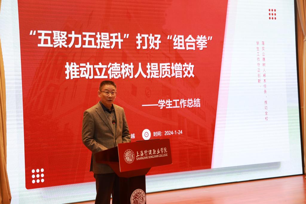 党委副书记李越以“‘五聚力五提升’打好‘组合拳’推动立德树人提质增效”为主题,从把稳一个中心、围绕两大主体、依托三大课堂、做优四个项目、推进五度标准五个方面,对2023年学生工作进行了总结。他充分肯定了学生工作取得的成绩,并提出新要求:做好学生工作,不是靠文山会海,更不是靠条条框框,而是要靠理念、方法和情感,要善于发现每个学生的潜能,鼓励学生成长成才。