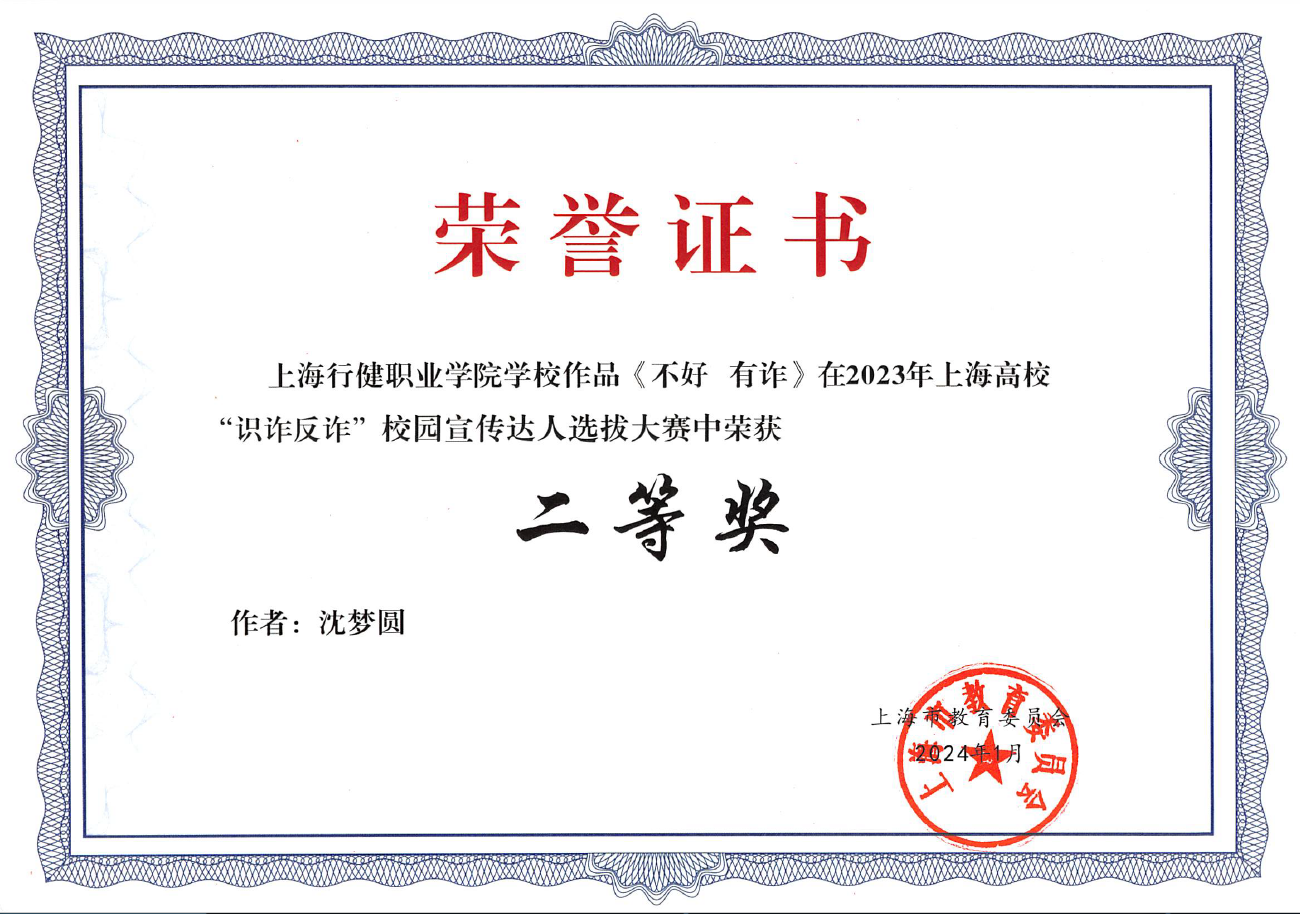 为深入贯彻落实习近平总书记对打击治理电信网络诈骗违法犯罪工作的重要指示批示精神,不断增强学校反诈工作针对性,全面筑牢学校反诈工作防火墙,有效维护本校师生财产安全,我校组织动员全体在校生积极参加市教委会同相关单位组织开展的2023年上海市高校“识诈反诈”系列宣传活动,并喜获两个二等奖,其中教育学院施伟荣老师指导的22级中高职贯通1班金雨彤同学的征文作品《你我同心 反诈同行》在2023年上海高校“识诈反诈”有奖征文活动中荣获二等奖;创意学院陈盐青老师指导的23级广告1班沈梦圆等同学的短视频作品《不好 有诈》在2023年上海高校“识诈反诈”校园宣传达人选拔大赛中荣获二等奖。