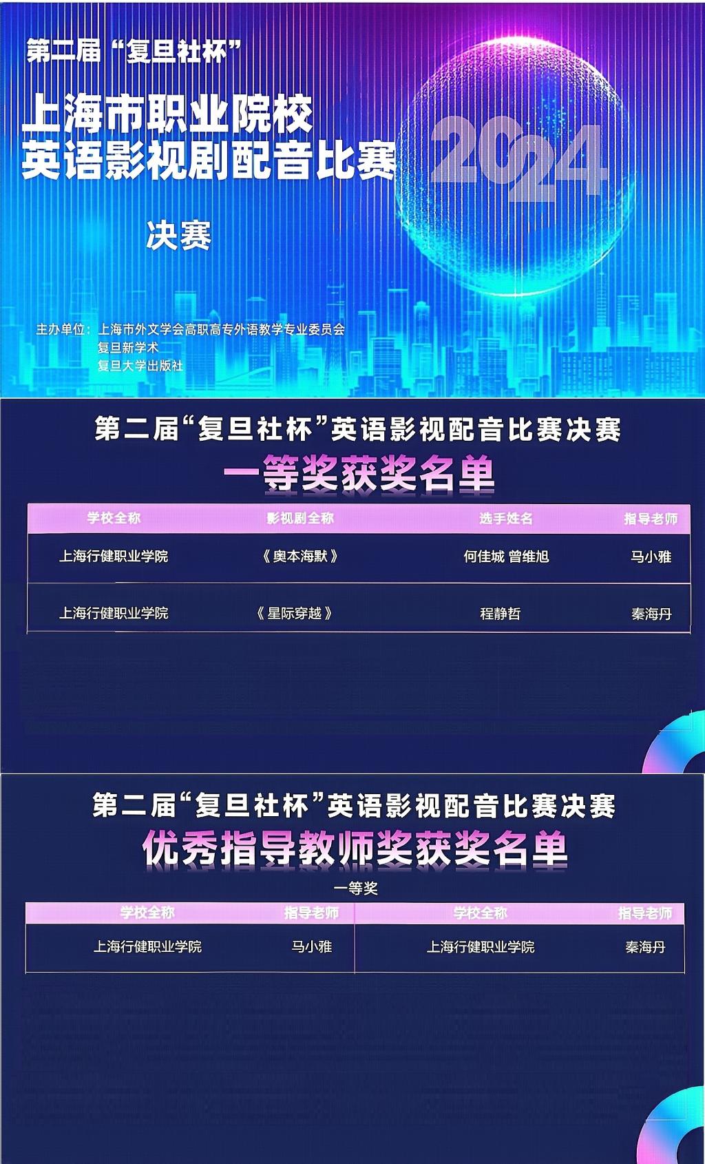 我校基础教育学院英语教研室全体教师动员学生积极参赛。4月下旬,基础教育学院英语教研室组织校内初赛,累计收集21份作品。经过教研室评选,最终推选出23学前教育婴托专业何佳城同学与23机电专业曾维旭同学的双人配音作品《奥本海默》和23网络专业程静哲同学的单人配音作品《星际穿越》两个作品参加上海市复赛。备赛期间,马小雅老师和秦海丹老师在把握参赛作品内容及思想的基础上,对学生语言的准确性和流利度、情感表达的契合度等配音技巧进行指导。复赛中,两个作品从全市六十多个作品中脱颖而出,顺利进入决赛。决赛现场,何佳城、曾维旭、程静哲三位同学稳定发挥,通过精湛的配音技巧,将原片中的情感与氛围完美呈现,最终2组选手双双取得一等奖的好成绩,展示了行健学子良好的专业素质和精神风貌。(基础学院)