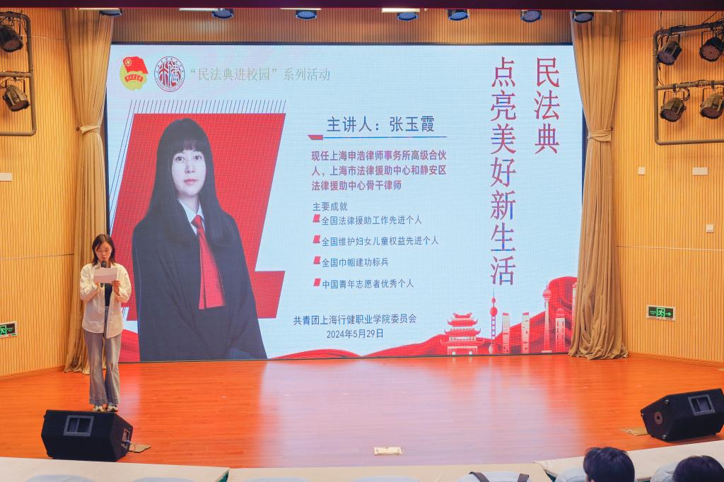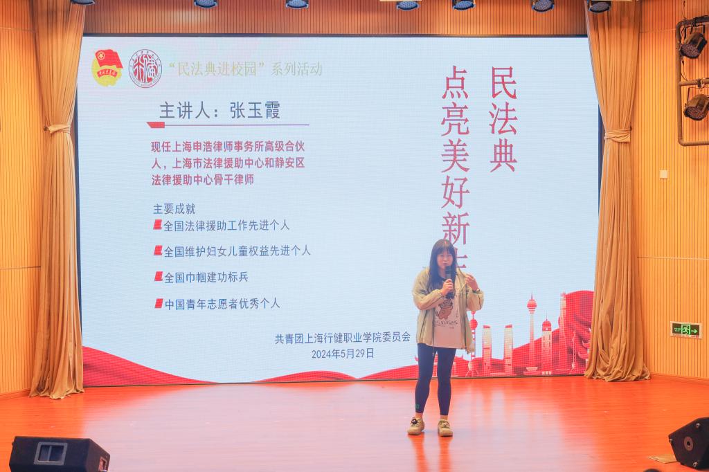 2024年5月是我国第四个“民法典宣传月”。为增强学生知法、守法、学法、用法的法治观念,使民法典学习宣传常态化、普及化,学校积极响应市教委“民法典进校园”活动要求,于5月29日特邀请上海申浩律师事务所张玉霞律师为学生们开展《民法典点亮美好新生活》专题讲座。