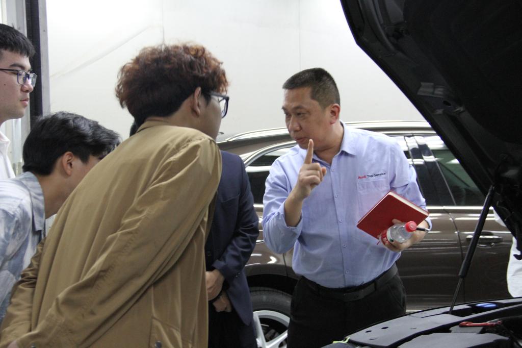 活动伊始,同学们首先参观了上海奥迪(大宁音乐广场都市店)和上海东联沪港汽车销售有限公司的维修车间和钱晨工匠职工创新工作室。本次活动,学生们有幸面对面对话三位行业领军人物:上海东联沪迪/沪虹奥迪汽车销售服务有限公司总经理、东联沪港奥迪4S店技术服务领军人钱晨,上海东联沪港汽车销售有限公司技术经理、荣获“静安能手”、奥迪高电压专家认证、机动车检测维修工程师称号的梅桂军以及东联沪港奥迪4S店钣喷主管、上海市汽车维修工高级技师施海燕,他带领的钣喷团队多次在专业比赛中获奖,拥有丰富的国内外学习与实践经验。