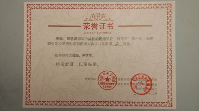【来源:学院师生在上海市“复旦社杯”英语影视剧配音大赛决赛中荣获佳绩 | 发布日期:2018-12-19】12月14日,第一届“复旦社杯”上海市职业院校英语影视剧配音大赛决赛在上海市工商外国语学校成功举行。此次大赛由教育部职业院校外语类专业教学指导委员会上海工作组和上海市外文学会高职高专外语教学专业委员会共同举办。