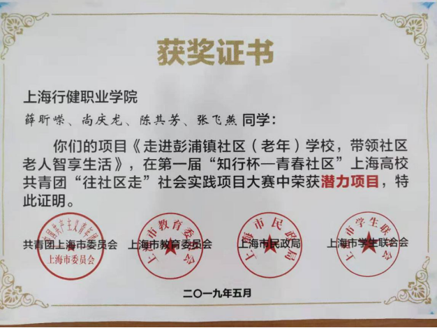 【来源:信机系学生志愿项目在第一届“知行杯——青春社区”上海高校共青团“往社区走”社会实践项目中荣获潜力项目荣誉称号 | 发布日期:2019-10-12】今年3月,信机系申报了由共青团上海市委员会、上海市教育委员会、上海市民政局、上海市学生联合会联合主办的第一届“知行杯——青春社区”上海高校共青团“往社区走”社会实践项目大赛,申报的《走进彭浦镇社区(老年)学校,带领社区老人志享生活》志愿服务项目在此次比赛中荣获潜力项目荣誉称号。