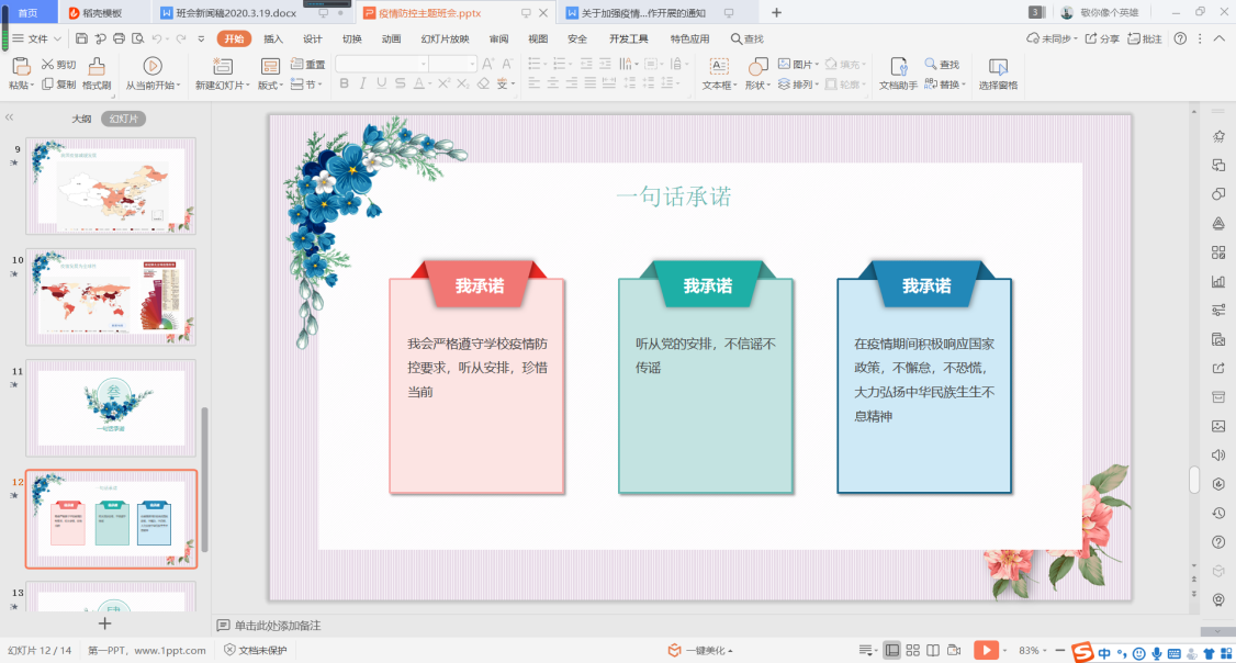 “疫情防控,你知我知大家知”。辅导员带领同学们集中学习疫情防控期间习近平总书记的重要指示精神,教育同学们科学认识疫情,不造谣、不信谣、不传谣;做好个人防护,不外出、不聚集,戴口罩、勤洗手、多消毒,加强身体锻炼,提高自身免疫力。班会上,学生们积极参与“一句话承诺”活动,争取做防控疫情的坚定拥护者、防控工作的坚定落实者,共同打赢疫情防控阻击战。