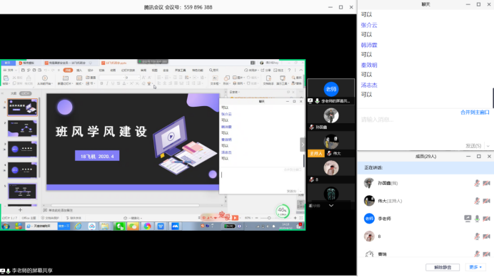18汽车、18飞机在辅导员李琴老师的组织下,开展“促学风建设,从自我做起”的主题班会,班会中,同学们联系自身,积极主动谈论云课堂以来的个人表现,分享线上学习经验。