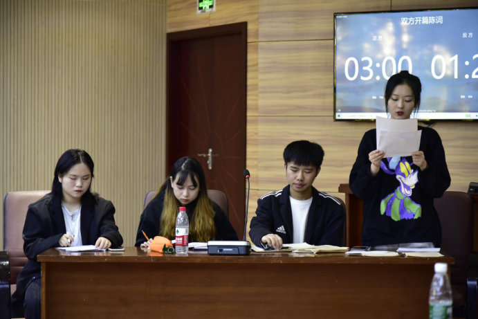 此次社会主义核心价值观明辩会围绕“社会秩序的维系主要靠法律还是道德”这个辩题展开。正方为信机系,四位辩手分别为19级网络专业周幼琳,20级网络专业宋文意,20级软件专业杨鹏和19级飞机专业王智清;反方为外语系,四位辩手分别为19级日语专业胡思思,19级少英专业张晋铭、李芷茵和20级法语专业沈娜。此次辩论赛可谓是水深火热,在主持人宣布辩论赛开始之后,场中的气氛就已经焦灼了起来。正方以“从古至今,不同地区都用法律来规范和维护社会秩序”这一论据步步紧逼着反方,而反方则以“道德的约束才是社会能平稳发展与维持秩序的关键”为由进行反驳。双方辩手都使出了浑身解数,他们逻辑分明,言辞犀利,场下高潮迭起,掌声不断。