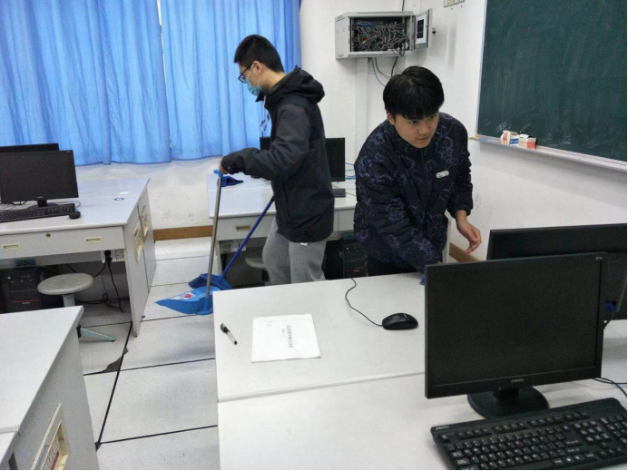 各位志愿者拿起扫帚、抹布、簸箕等工具对力行楼4207、4208两个教室进行了全方位的清理打扫。打扫过程中,各位志愿者分工合作、有条不紊,扫地面、擦黑板、擦拭室内实训设施等等。同学们不怕脏、不怕累,经过一个小时的辛勤劳动,实训教室变得干净整洁,为信机系师生提供了一个良好的实训学习场所。