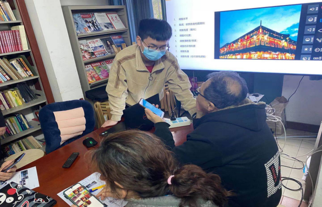 针对时下手机的应用程度,考虑到老年人拍照的实际需求,此次信机系学生志愿者从最基础的《照相与摄影的区别与基本构图 》开始讲解,指导大家发现身边的生活美景,如街景、城市建筑、美食、人物等,引导老年人掌握手机拍照的选景技巧。学生志愿者还给大家分享了摄影的光线调节和拍照基础设置用法以及手机后期制作技巧。每分享到一个新的方法,学生志愿者就和居民一起拍摄起来,边拍边指导,“老师你看我拍的这个行不行?”“老师你看我拍的这张哪里不好?”学生志愿者被学习的老人簇拥着,老人们学习热情高涨。