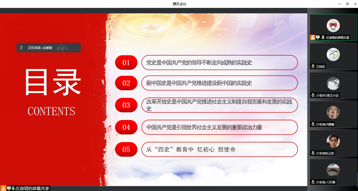 随后,庄淑珺老师通过短视频和PPT讲解带领大家深入地学习有关“四史”的知识,党史是中国共产党的领导不断走向成熟的实践史、新中国史是中国共产党推进建设新中国的实践史、改革开放史是中国共产党推进社会主义制度自我完善和发展的实践史、中国共产党是引领世界社会主义发展的重要政治力量。同时,强调指出“四史”内容各有侧重,但整体讲的就是中国共产党为人民谋幸福、为民族谋复兴、为世界谋大同的实践史,中国共产党的领导是“四史”的主线。作为青年大学生,要学会从“四史”教育中汲取信仰之力,把稳思想之舵;更要汲取发展之力,把使命永担在肩,做一个“仰望星空、勇于担当,紧跟时代、甘于奉献”的人。