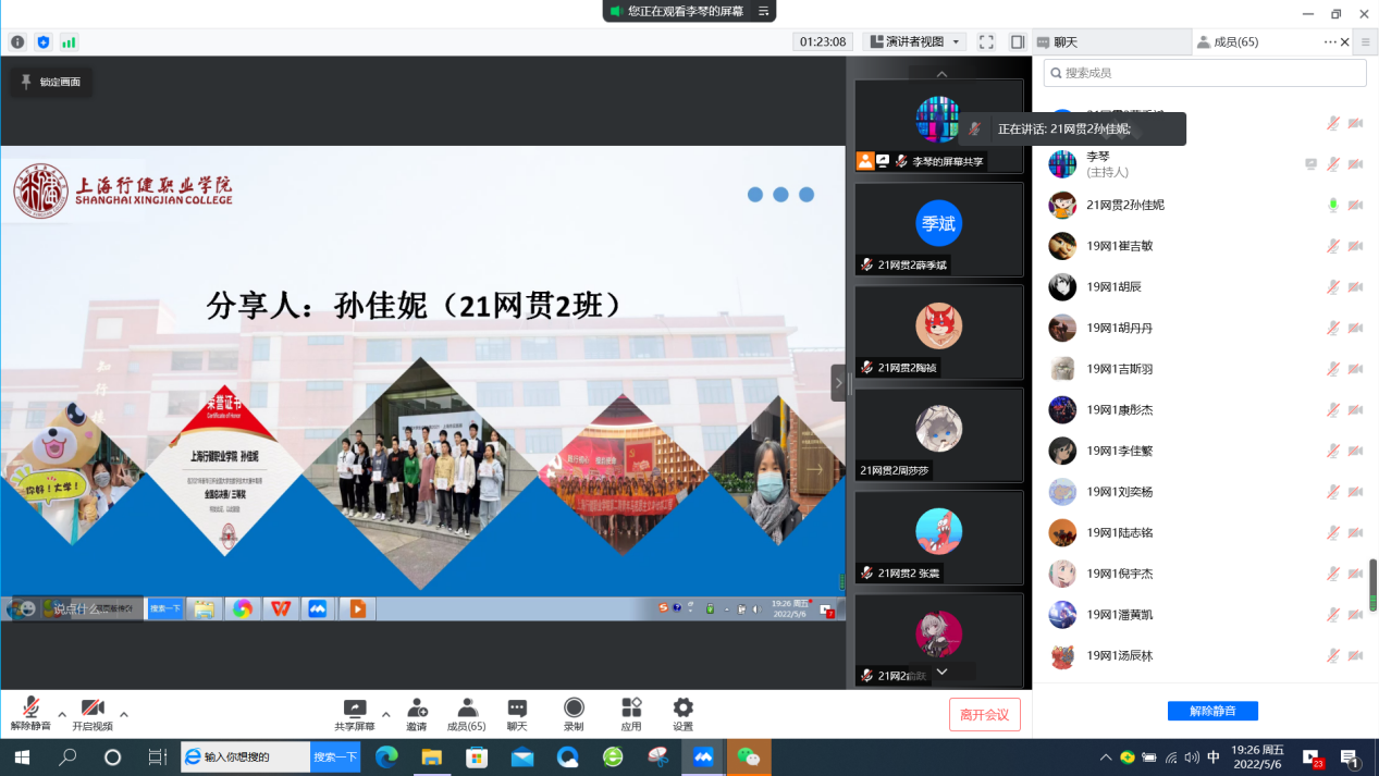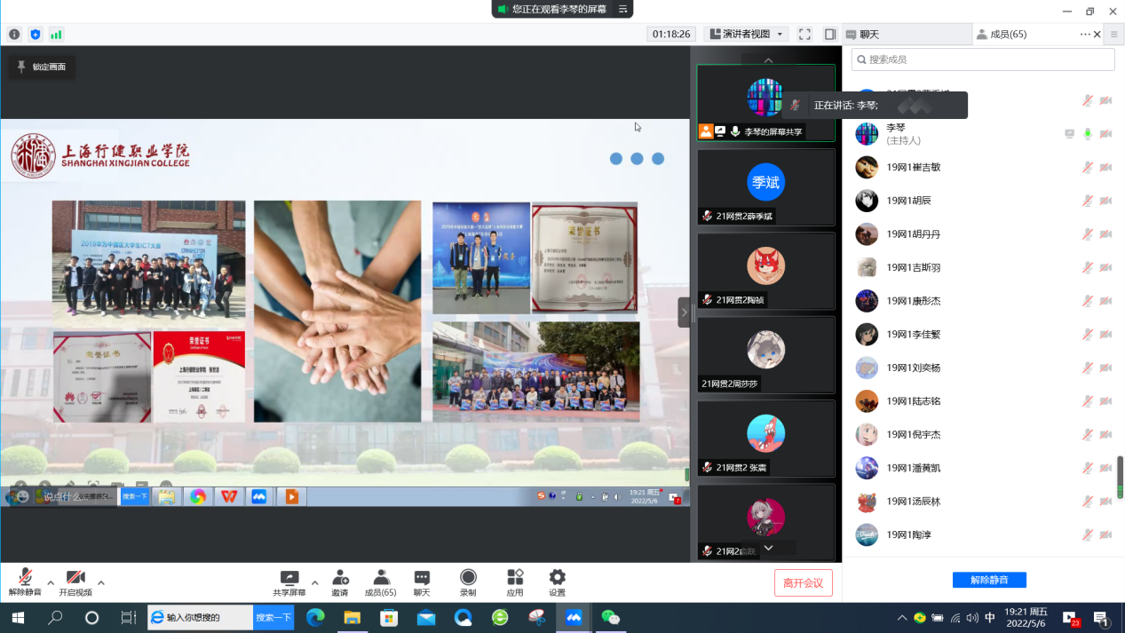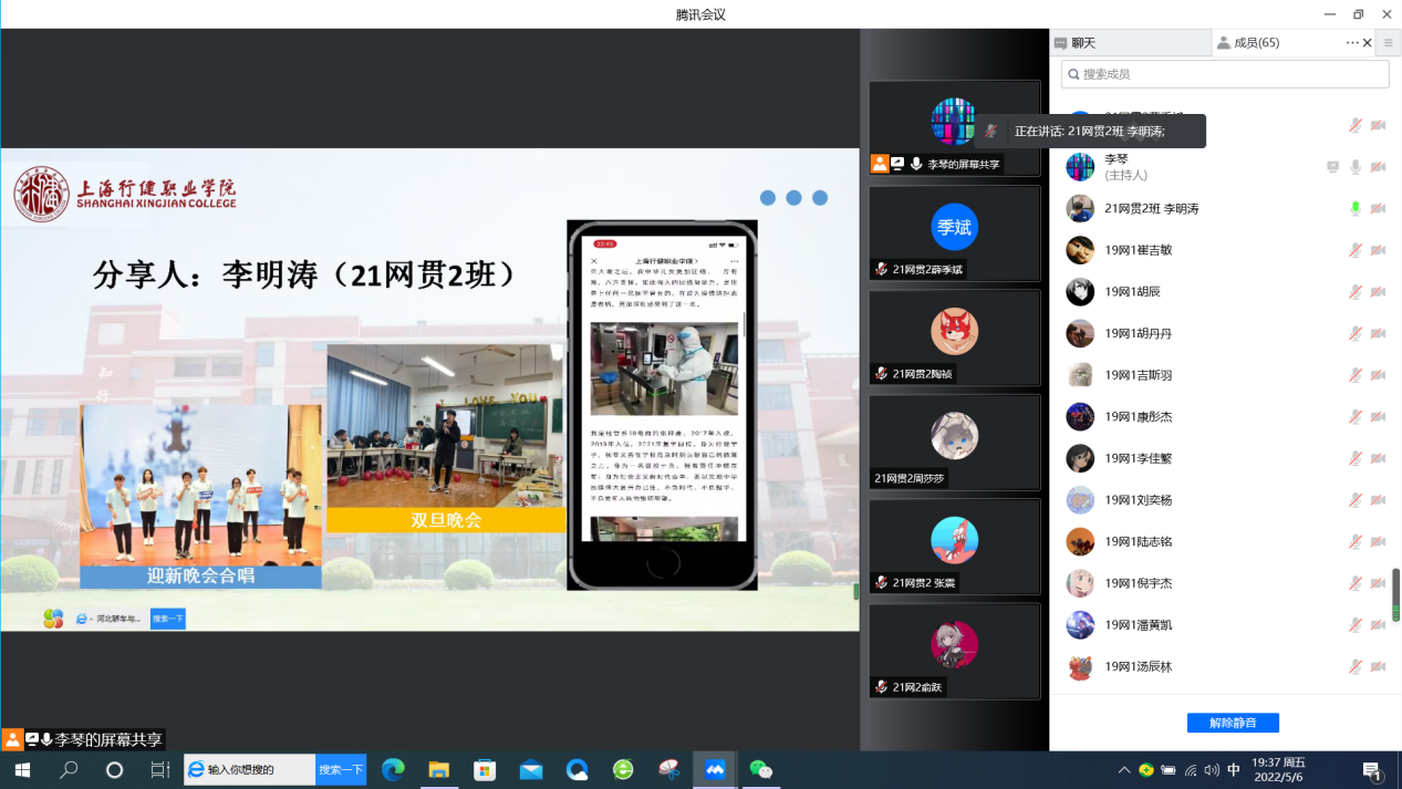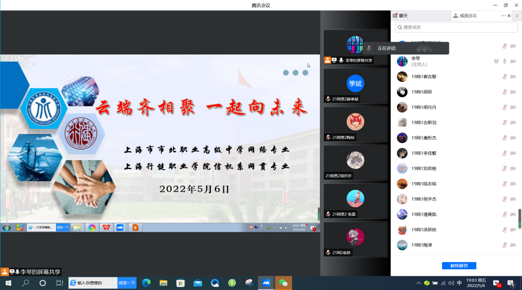 【来源:云端齐相聚 一起向未来 ——信机系网贯专业与市北职高网络专业交流班会 | 发布日期:2022-05-09】为帮助中职生提前了解大学生活,进一步加强网络专业中高职学生之间的联系,5月6日,信机系21网贯2班与市北职高高三年级19网络1班联合召开“云端齐相聚 一起向未来”线上主题班会。除了两个班级学生,还有信机系网络专业主任杨柳老师、英语教研室秦海丹老师、市北职高教务处主任王永进老师和班主任昌鸣老师出席,会议由辅导员李琴老师主持。