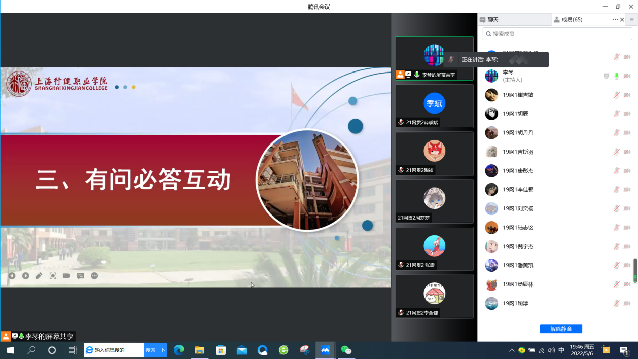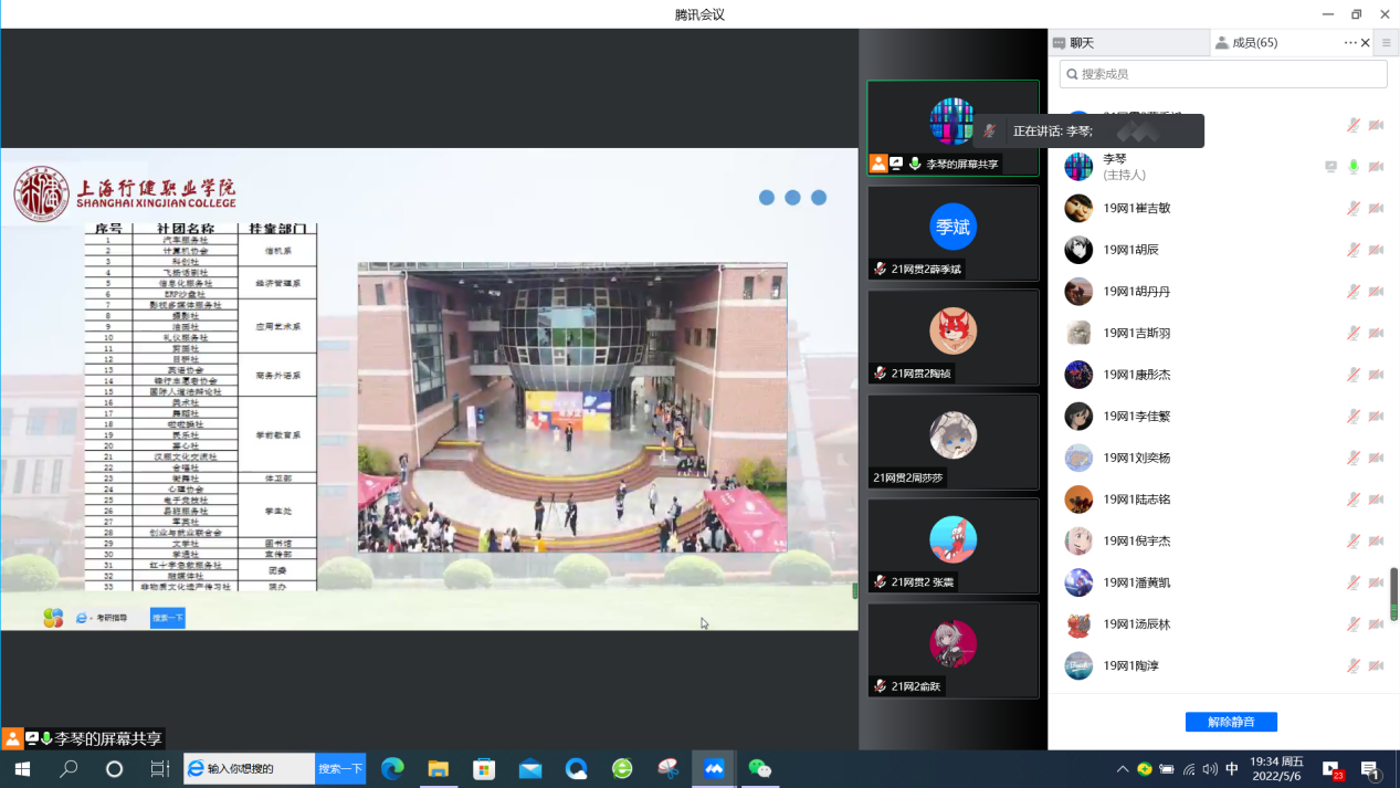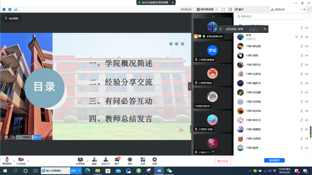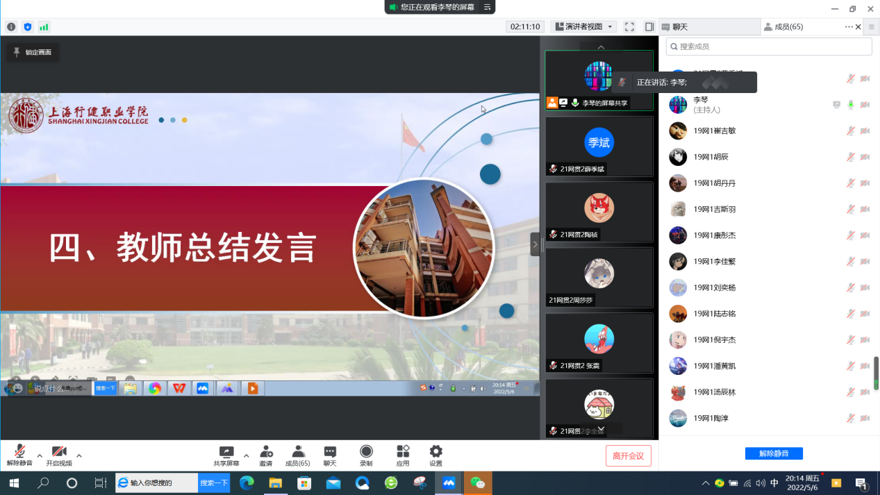 【来源:云端齐相聚 一起向未来 ——信机系网贯专业与市北职高网络专业交流班会 | 发布日期:2022-05-09】为帮助中职生提前了解大学生活,进一步加强网络专业中高职学生之间的联系,5月6日,信机系21网贯2班与市北职高高三年级19网络1班联合召开“云端齐相聚 一起向未来”线上主题班会。除了两个班级学生,还有信机系网络专业主任杨柳老师、英语教研室秦海丹老师、市北职高教务处主任王永进老师和班主任昌鸣老师出席,会议由辅导员李琴老师主持。
