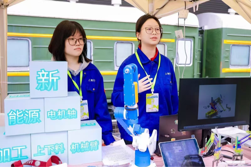 参赛项目以集市方式集中展示,我院学子通过摊位布置、作品介绍、现场演示的方式与评委和观众进行了全方面地展示和交流。其中刘芸菲团队提出《新能源电机轴加工上下料机械臂》项目通过作品展示与实物体验。