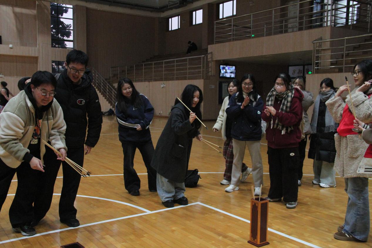 投壶项目现场,古色古香的活动形式让同学们眼前一亮。活动志愿者早已准备好投壶器材。每一次箭支入壶,现场都响起阵阵欢呼;即便未能投中,大家也毫不气馁,调整姿态再次尝试,在传统趣味运动中感受着竞技与快乐并存的独特魅力。