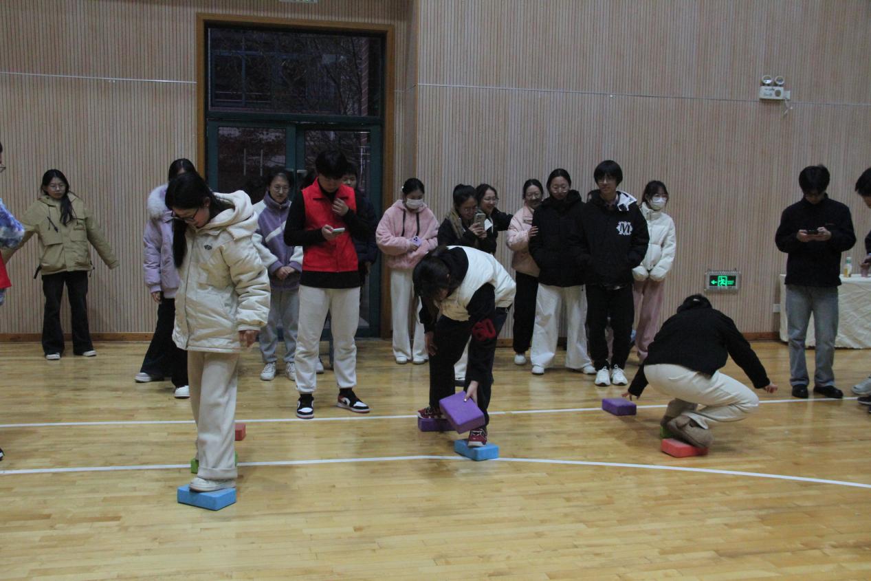另一边的搭桥过河项目同样精彩纷呈。该项目以个人为单位,参赛同学迅速踏上泡沫砖块,灵活地挪动脚步、切换砖块位置,在保持平衡的同时奋力向终点冲刺。赛道旁,围观同学的加油声、呐喊声此起彼伏,为参赛选手注入了强劲动力。大家在紧张刺激的比拼中,不仅锻炼了身体协调性和平衡能力,更展现出不慌不忙、勇于挑战的良好心态。
